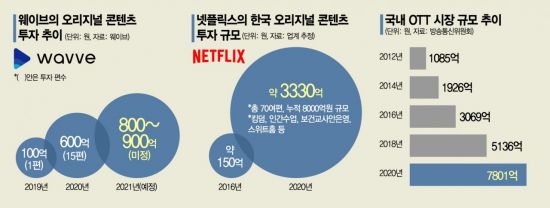 국내 진출 첫해인 2016년만 해도 150억원에 불과하던 넷플릭스의 한국 콘텐츠 투자 규모가 연간 3000억원대까지 20배 이상 확대된 배경도 여기에 있다. SK경영경제연구소는 앞서 OTT 관련 보고서를 통해 "높은 해지율을 방어하면서도 경쟁 사업자들과 차별화된 무엇을 제공해야 한다는 숙제, 이에 대한 해답이 바로 오리지널 콘텐츠"라고 평가했다.