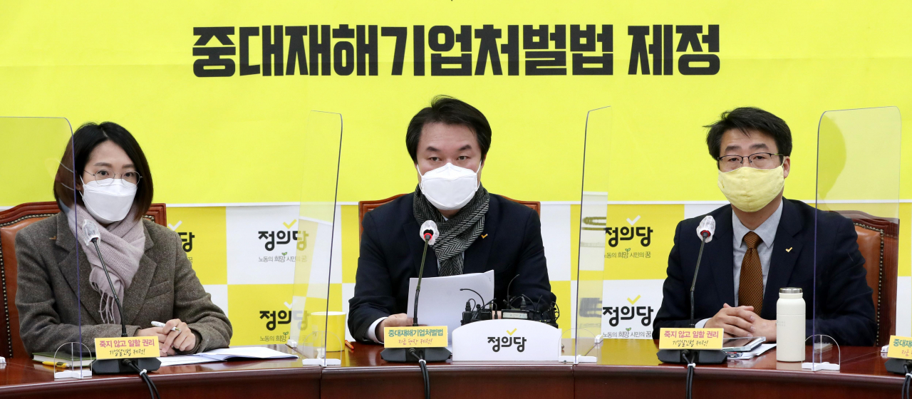 한편, 이날 회의에서는 중대재해기업처벌법 제정을 촉구하며 단식투쟁 중 입원한 강은미 정의당 원내대표와 관련한 언급이 이어졌다. 김 대표는 “아직도 고 김용균 노동자의 어머니와 고 이한빛 PD의 아버지, 운동본부 이상진 집행위원장은 국회에서 25일째 단식을 이어가고 있다”며 “정부는 ‘중대재해기업보호법’에 가까운 안을 들고 강 원내대표와 산업재해 유가족들이 단식 중인 국회를 찾았다. 그야말로 무책임의 극치”라고 강하게 비판했따.