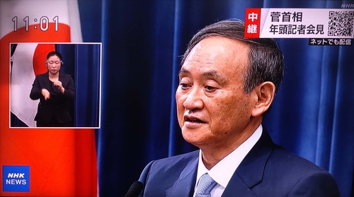 (도쿄=연합뉴스) 스가 요시히데 일본 총리가 4일 신년 기자회견을 열고 있다. [NHK 중계화면 캡처] |