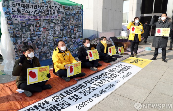 [서울=뉴스핌] 이형석 기자 = 김종철 정의당 대표와 부대표단, 의원들이 4일 국회에서 온전한 중대재해기업처벌법 제정 총력 집행행동 및 동조단식을 하고 있다. 2021.01.04 leehs@newspim.com
