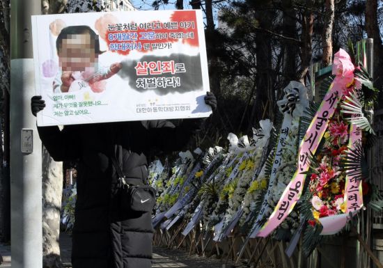지난달 14일 오후 서울남부지검 앞에 '16개월 영아 학대 사망 사건'과 관련해 숨진 아이를 추모하는 근조화환이 늘어서 있다. / 사진=연합뉴스 |