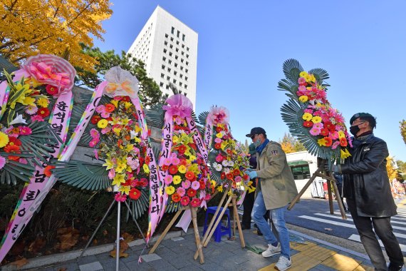 윤석열 검찰총장을 지지하는 화환이 서울 서초구 대검찰청 청사 앞에 놓여 있는 모습. 사진=서동일 기자 |