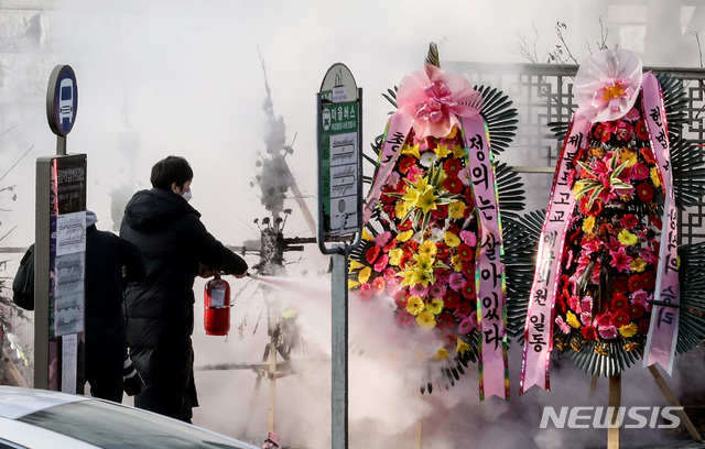 대검찰청 관계자들이 지난 5일 오전 서울 서초구 대검찰청 앞에서 70대 남성이 윤석열 검찰총장 지지 화환에 불을 붙이자 소화기로 진화하고 있다./사진=뉴시스 |