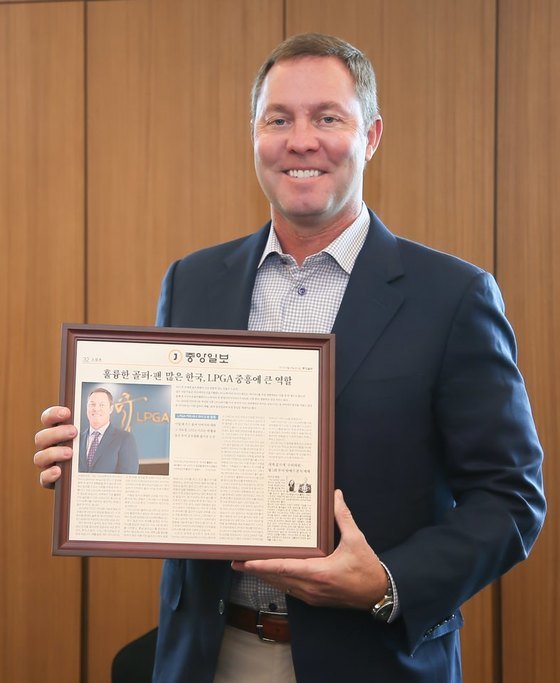 지난 2010년 미국여자프로골프협회(LPGA)의 수장을 맡은 마이크 완 커미셔너. 중앙일보에 칼럼을 기고한 완 커미셔너가 칼럼이 담긴 동판을 들고 웃고 있다. [사진 JNA] |
