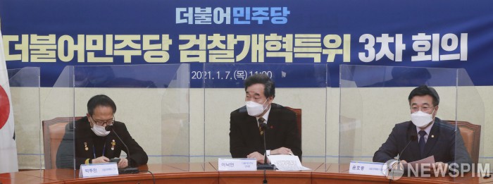 [서울=뉴스핌] 이형석 기자 = 윤호중 위원장(오른쪽)이 7일 오전 서울 여의도 국회에서 열린 더불어민주당 검찰개혁특위 3차 회의에서 모두발언을 하고 있다. 2021.01.07 leehs@newspim.com