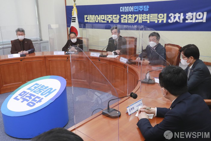 [서울=뉴스핌] 이형석 기자 = 윤호중 위원장(오른쪽 세번째)이 7일 오전 서울 여의도 국회에서 열린 더불어민주당 검찰개혁특위 3차 회의에서 모두발언을 하고 있다. 2021.01.07 leehs@newspim.com