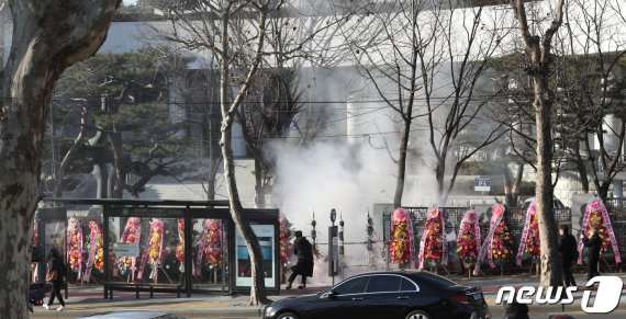 5일 서울 서초구 대검찰청에서 신원 미상의 한 시민이 윤석열 검찰총장 응원 화환에 불을 붙여 관계자들이 진압하고 있다. /사진=뉴스1 |