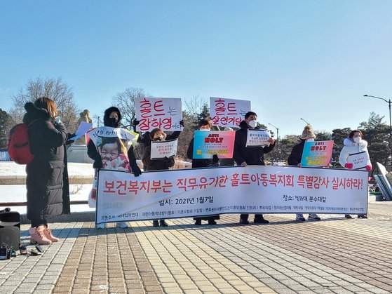 아동인권단체는 7일 오전 11시 청와대 분수대 앞에서 '홀트아동복지회에 대한 특별감사 촉구 기자회견'을 열었다. 권혜림 기자 |