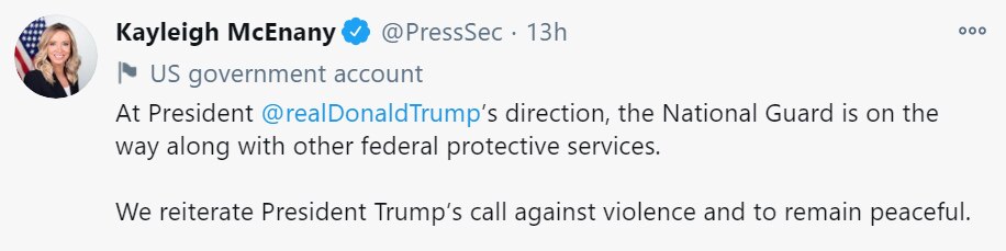 대통령 지시에 따라, 방위군이 출동했다는 백악관 대변인의 트윗 |