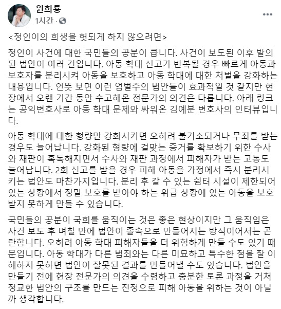 원 지사는 이날 자신의 페이스북을 통해 "국민들의 공분이 국회를 움직이는 것은 좋은 현상이지만, 그 움직임은 사건 보도 후 며칠 만에 법안이 졸속으로 만들어지는 방식이어서는 곤란하다"며 이같이 말했다.