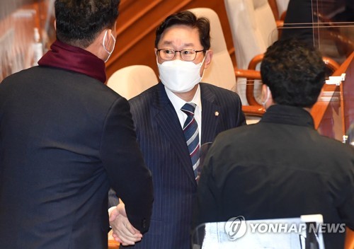 의원들과 인사하는 박범계 법무부 장관 후보자 |