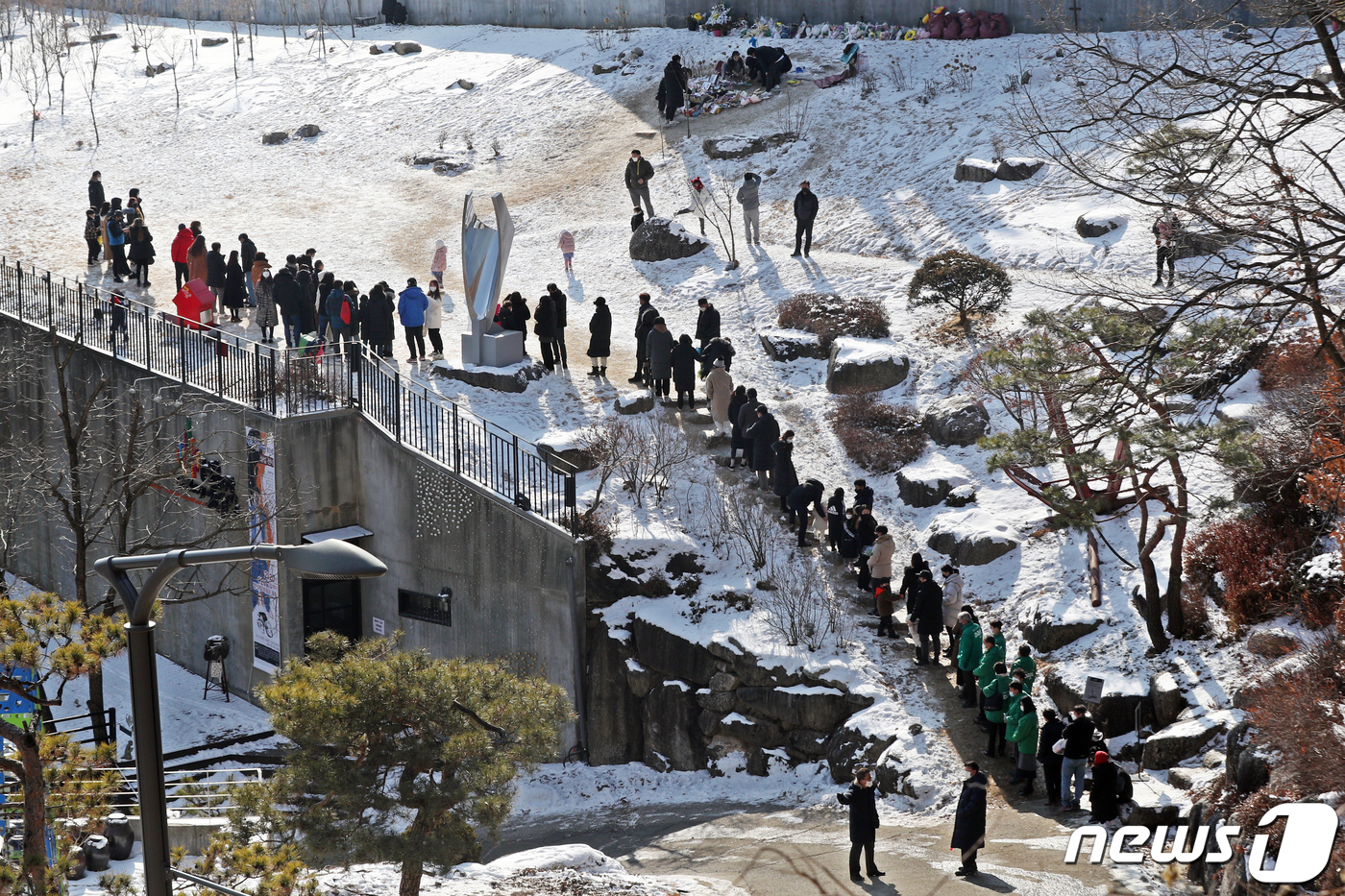 (양평=뉴스1) 황기선 기자 = 10일 오후 경기 양평 하이패밀리 안데르센 공원묘원에서 시민들이 양부모의 학대로 숨진 16개월 영아 정인(가명)양을 추모하기 위해 줄을 서 있다.