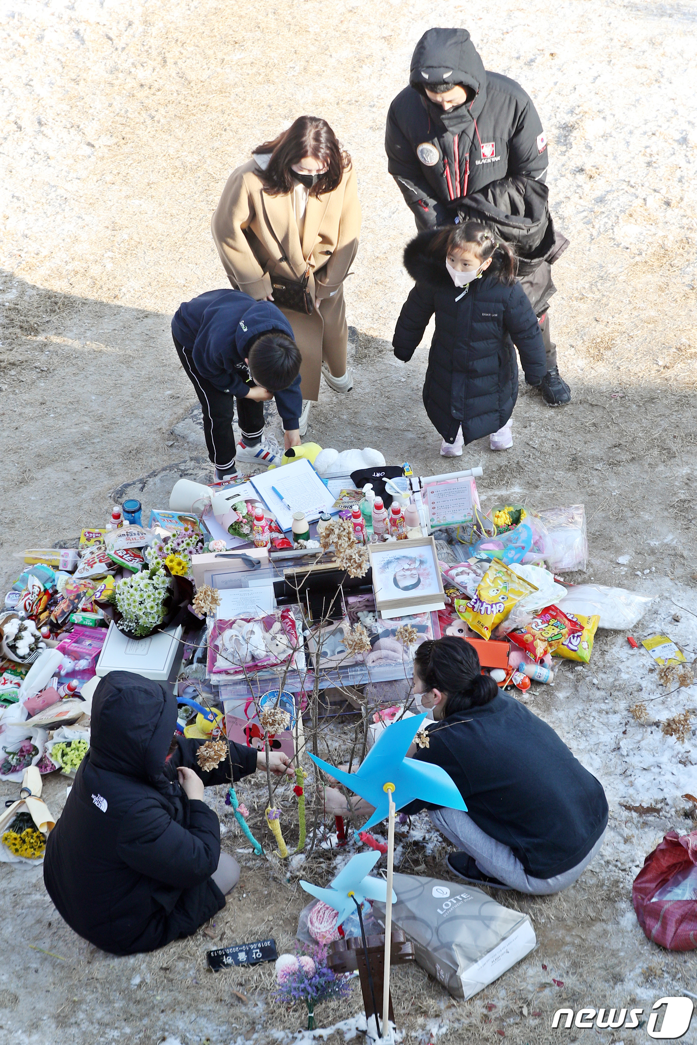 (양평=뉴스1) 황기선 기자 = 10일 오후 경기 양평 하이패밀리 안데르센 공원묘원에서 시민들이 양부모의 학대로 숨진 16개월 영아 정인(가명)양을 추모하고 있다. 2021.1.10/뉴스1