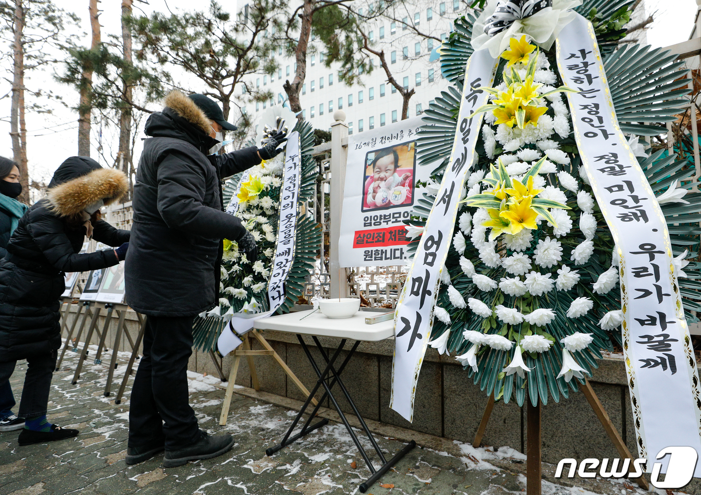 (서울=뉴스1) 안은나 기자 = 대한아동학대방지협회 관계자들이 11일 오전 서울 양천구 남부지방검찰청 앞에서 정인이 양부모 재판을 이틀 앞두고 엄벌을 촉구하며 근조화환을 설치하고 있다. 2021.1.11/뉴스1