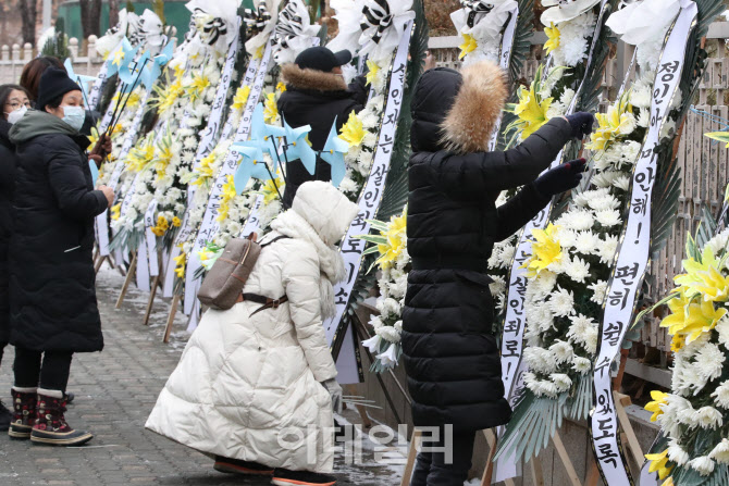 [이데일리 이영훈 기자] '정인이 사건' 피의자 입양모에 대한 1차 공판기일을 이틀 앞둔 11일 오전 서울 양천구 서울남부지검 앞에서 대한아동학대방지협회 회원들이 근조화환을 설치하고 있다.