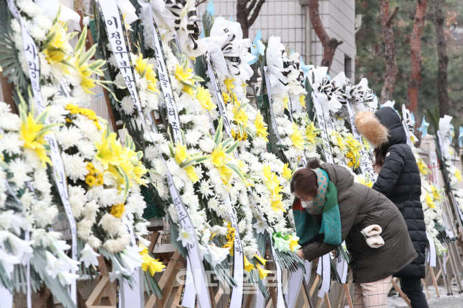 [이데일리 이영훈 기자] '정인이 사건' 피의자 입양모에 대한 1차 공판기일을 이틀 앞둔 11일 오전 서울 양천구 서울남부지검 앞에서 대한아동학대방지협회 회원들이 근조화환을 설치하고 있다.