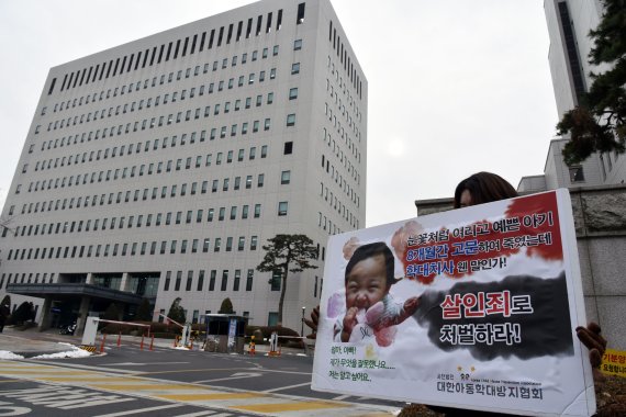 학대를 받아 숨진 것으로 알려진 정인이 양부모에 대한 재판을 이틀 앞둔 11일 오전 서울 양천구 서울남부지방검찰청 앞에서 대한아동학대방지협회 회원이 살인죄 처벌을 촉구하며 1인 시위를 하고 있다. 사진=서동일 기자