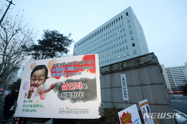 [서울=뉴시스]배훈식 기자 = 학대를 받아 숨진 것으로 알려진 정인이 양부모에 대한 재판을 이틀 앞둔 11일 오전 서울 양천구 서울남부지방검찰청 앞에서 대한아동학대방지협회 회원이 살인죄 처벌을 촉구하며 1인 시위를 하고 있다. 2021.01.11. dahora83@newsis.com |