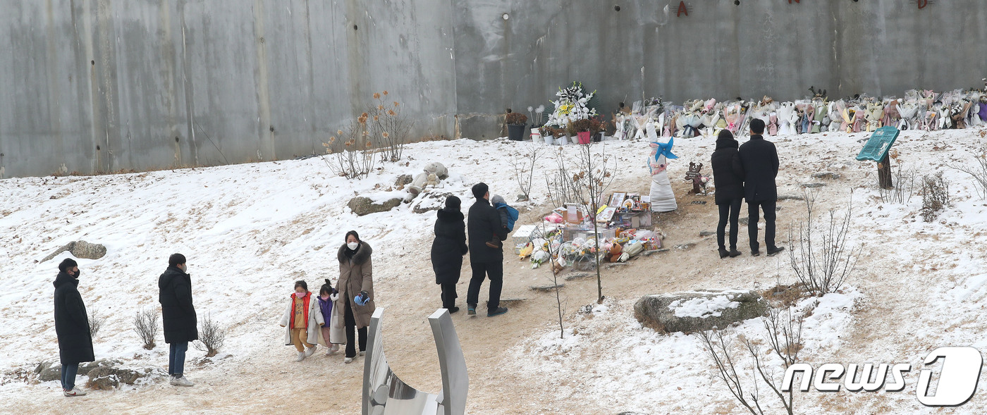 (양평=뉴스1) 임세영 기자 = 11일 오후 경기 양평 하이패밀리 안데르센 공원묘원에서 시민들이 양부모의 학대로 숨진 16개월 영아 정인(가명)양을 추모하고 있다. 2021.1.11/뉴스1
