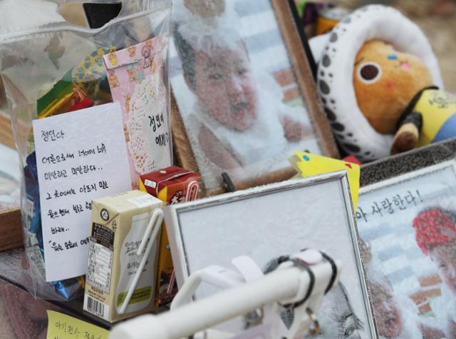 경기도 양평군 하이패밀리 안데르센 공원묘원에 11일 양부모의 학대로 생후 16개월 만에 사망한 정인 양을 추모하며 시민들이 두고 간 선물과 메시지 등이 놓여 있다. 연합뉴스 |