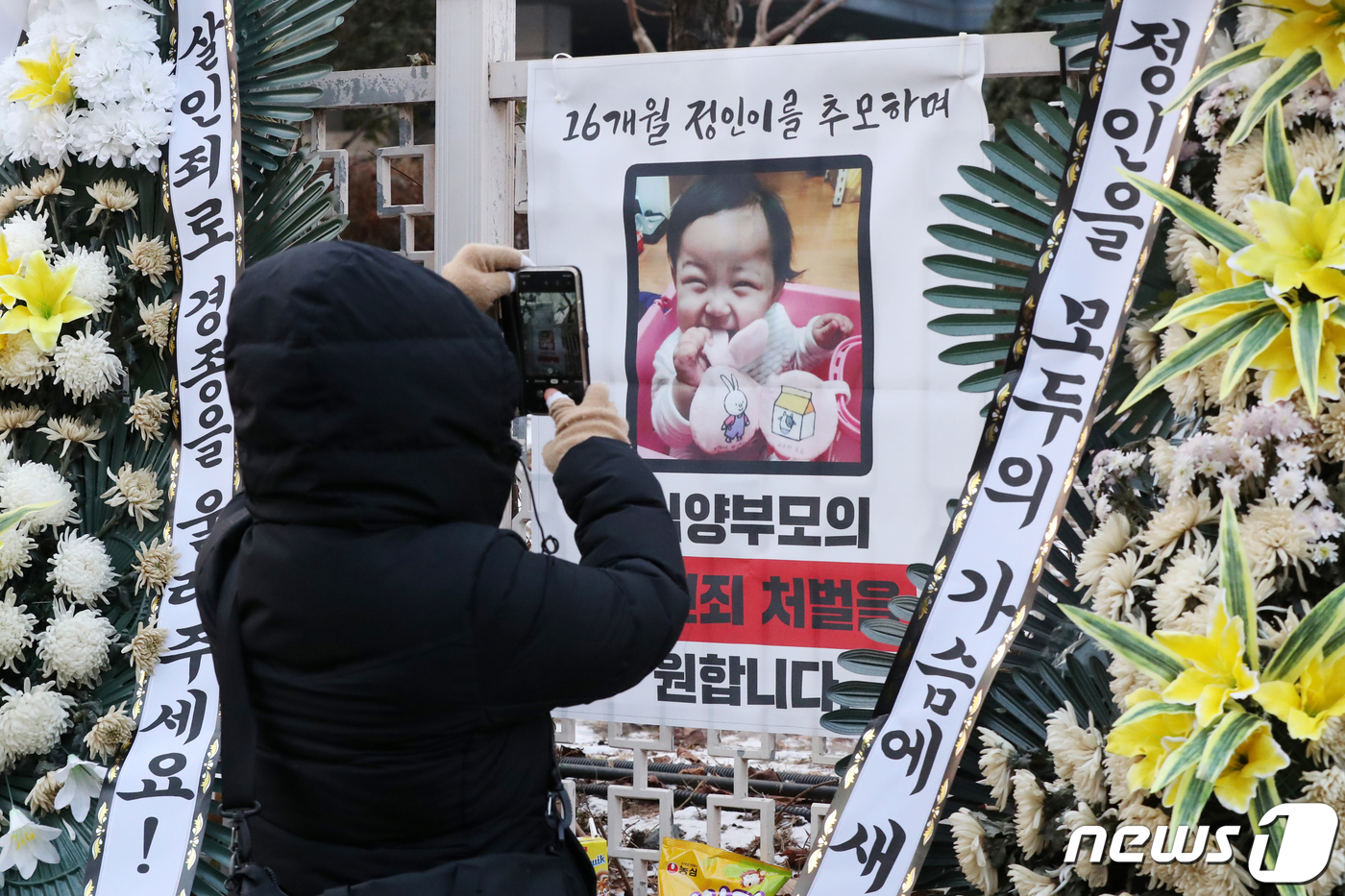 12일 오전 서울 양천구 남부지방검찰청 앞에 마련된 정인이를 위한 추모 공간에서 한 시민이 정인이의 모습을 휴대전화 카메라에 담고 있다. 2021.1.12/뉴스1