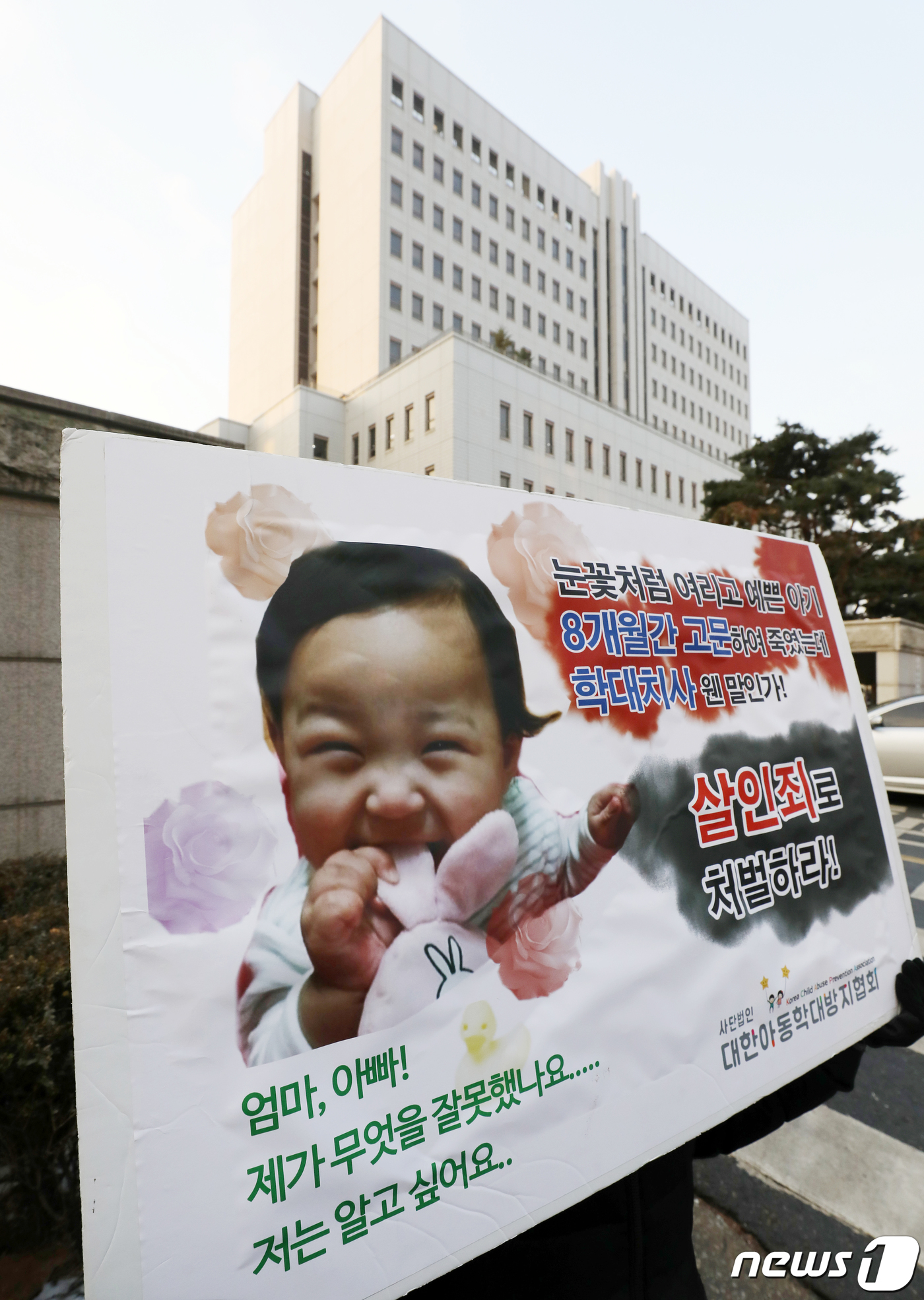 대한아동학대방지협회 관계자가 12일 오전 서울 양천구 남부지방법원 앞에서 사법부가 정인이 양부모를 살인죄로 처벌할 것을 촉구하며 1인 시위를 하고 있다.