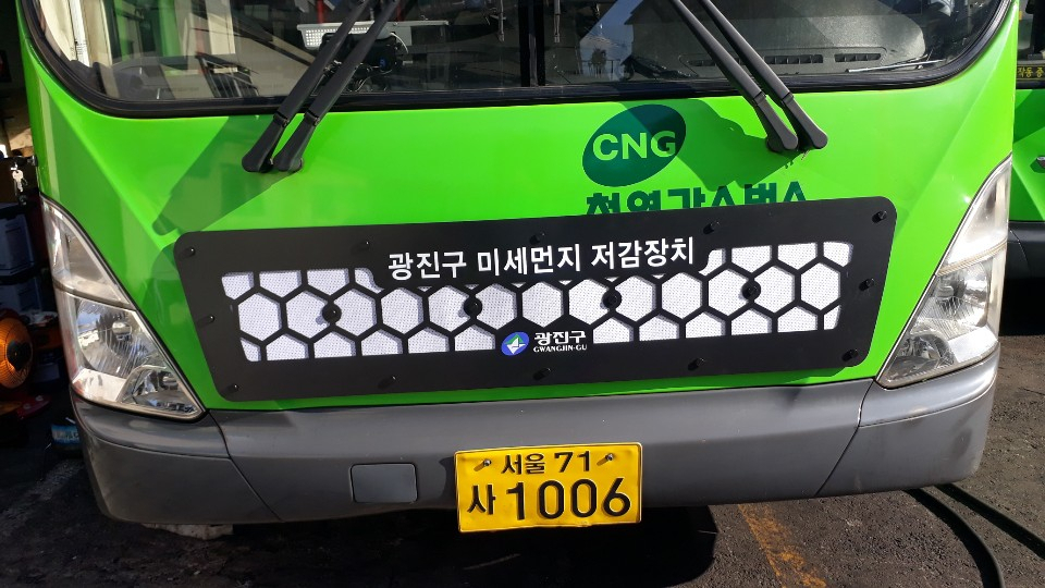 광진구에 따르면 최근 지역 내 마을버스 38대와 관용차량 34대 총 72대 차량의 외부 앞면(그릴)에 미세먼지 흡착 필터가 부착됐다. 구는 필터가 부착된 차량들이 지역 내 도로를 운행하면서 공기 중의 미세먼지 입자를 흡착한다.