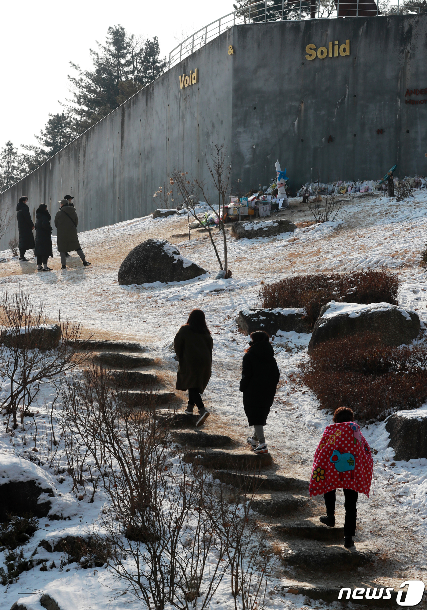 (양평=뉴스1) 구윤성 기자 = 12일 오후 경기도 양평 하이패밀리 안데르센 공원묘원에서 시민들이 양부모의 학대로 숨진 16개월 영아 정인(가명)양을 추모하고 있다. 서울남부지법 형사13부(신혁재 부장판사)는 오는 13일 아동학대처벌법 위반(아동학대치사) 등 혐의로 구속기소된 정인이의 양모 장모씨와 아동복지법 위반(아동유기·방임) 등 혐의를 받는 양부 안모씨의 첫 공판을 연다. 2021.1.12/뉴스1
