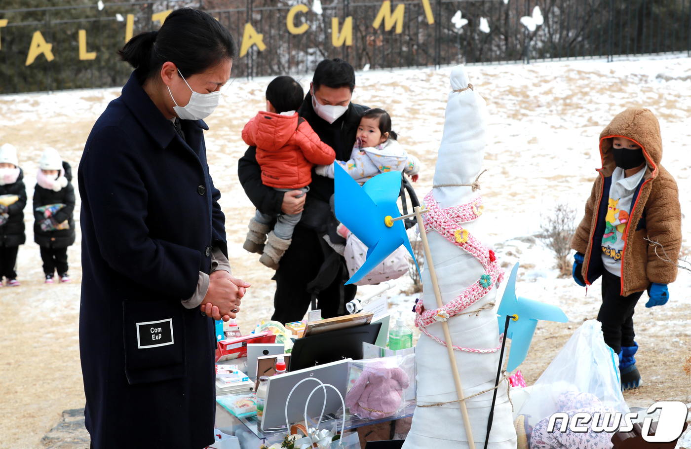 (양평=뉴스1) 구윤성 기자 = 12일 오후 경기도 양평 하이패밀리 안데르센 공원묘원에서 시민들이 양부모의 학대로 숨진 16개월 영아 정인(가명)양을 추모하고 있다. 서울남부지법 형사13부(신혁재 부장판사)는 오는 13일 아동학대처벌법 위반(아동학대치사) 등 혐의로 구속기소된 정인이의 양모 장모씨와 아동복지법 위반(아동유기·방임) 등 혐의를 받는 양부 안모씨의 첫 공판을 연다. 2021.1.12/뉴스1