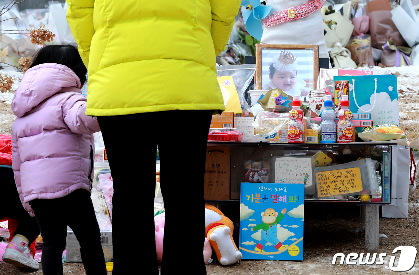 (양평=뉴스1) 구윤성 기자 = 12일 오후 경기도 양평 하이패밀리 안데르센 공원묘원에서 시민들이 양부모의 학대로 숨진 16개월 영아 정인(가명)양을 추모하고 있다. 서울남부지법 형사13부(신혁재 부장판사)는 오는 13일 아동학대처벌법 위반(아동학대치사) 등 혐의로 구속기소된 정인이의 양모 장모씨와 아동복지법 위반(아동유기·방임) 등 혐의를 받는 양부 안모씨의 첫 공판을 연다. 2021.1.12/뉴스1