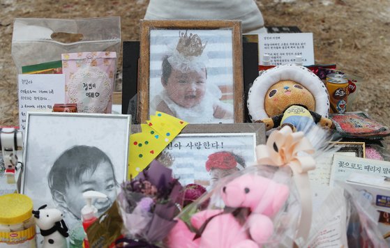 11일 오전 경기도 양평군 하이패밀리 안데르센 공원묘원에 양부모의 학대로 생후 16개월 만에 사망한 정인 양을 추모하며 시민들이 두고 간 선물과 메시지 등이 놓여 있다. 연합뉴스 |