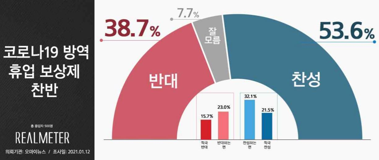 13일 리얼미터가 오마이뉴스 의뢰로 전날 실시한 코로나19 방역 휴업 보상제 찬반 조사 결과 찬성 응답은 53.6%(적극 찬성 21.5%, 찬성하는 편 32.1%)로 집계됐다. 휴업 보상제에 ‘반대한다’는 응답은 38.7%(적극 반대 15.7%, 반대하는 편 23.0%)였고, ‘잘 모르겠다’는 응답은 7.7%였다.