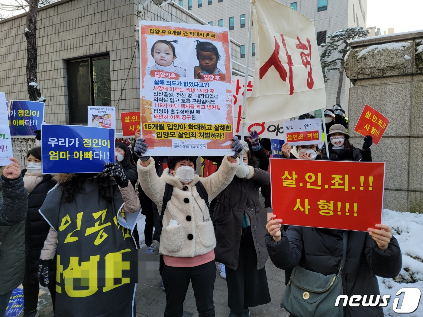 이날 오전 7시45분께 아동학대방지협회 회원 30여명이 붉은 글씨로 '사형'이라고 적은 마스크를 쓴 채 법원 앞에 집결했다.