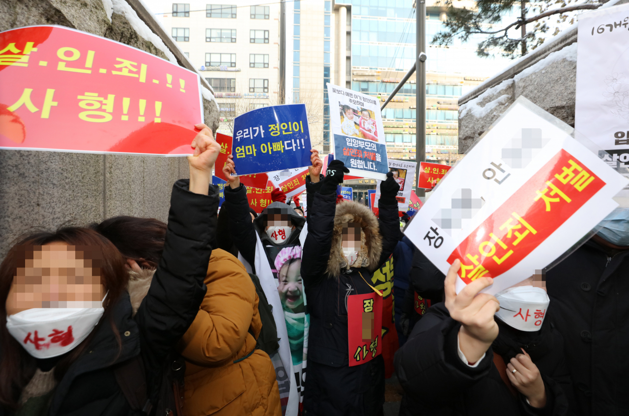 16개월 된 입양 딸 정인양을 학대해 숨지게 한 혐의를 받는 양부모에 대한 첫 공판이 열린 13일 서울 양천구 서울남부지법 앞에서 시민들이 시위를 벌이고 있다. [연합] |