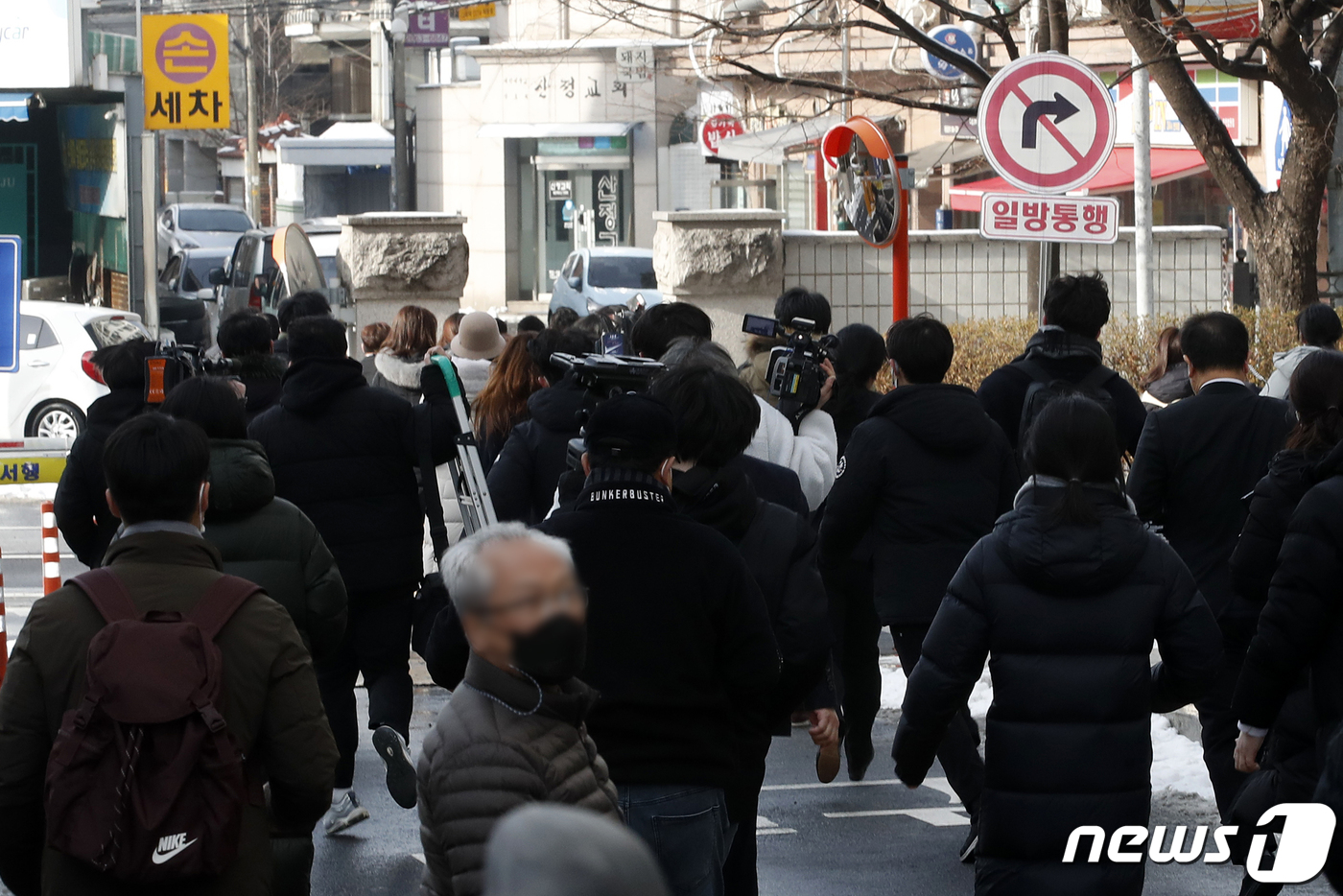(서울=뉴스1) 이승배 기자 = 정인양을 입양한 후 수개월간 학대해 사망에 이르게 한 혐의를 받는 양부 안모씨가 13일 오전 서울 양천구 서울남부지방법원에서 열린 아동복지법위반(아동유기‧방임) 등 첫 공판기일을 마치고 법원 청사를 달려나가자 취재진과 시민들이 쫓아가고 있다. 2021.1.13/뉴스1