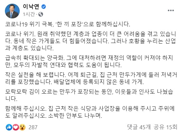 신종 코로나바이러스 감염증(코로나19)에 따른 양극화 해소 방안으로 ‘이익공유제’를 제안했던 이낙연 더불어민주당 대표가 14일 ‘한 끼 포장’으로 자영업자들의 위기 극복에 힘을 보태자고 밝혔다.