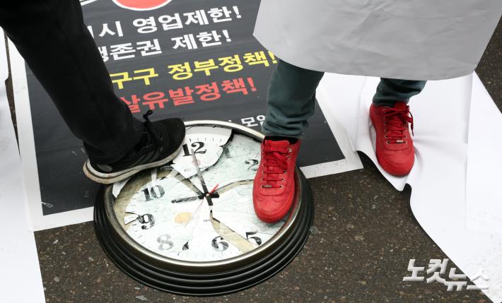 음식점·호프점연합회 관계자들이 15일 오후 서울 여의도 더불어민주당사 앞에서 ‘생존권 보장 촉구’ 집회를 갖고 있다.