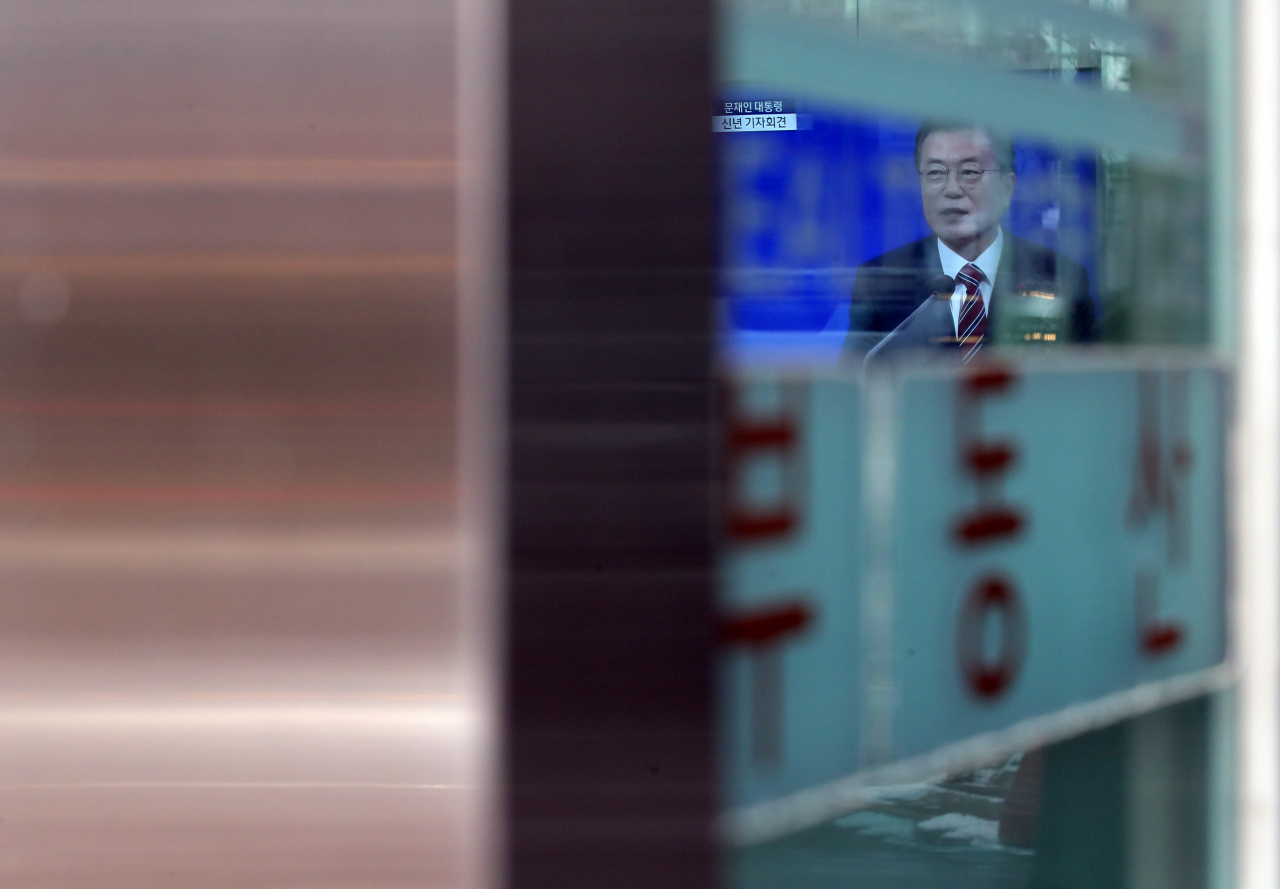 문재인 대통령은 18일 오전 청와대 춘추관에서 가진 신년 기자회견에서 부동산문제와 관련해 다시 한번 정책 실패를 인정하면서 기존 투기 억제에 더해 특단의 공급 확대를 해법으로 제시했다. 서울 송파구의 한 부동산중개업소 내에서 문 대통령의 기자회견 생중계를 지켜보고 있다. [연합] |