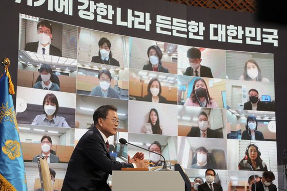 문재인 대통령이 18일 청와대 춘추관에서 온·오프 혼합 방식의 신년 기자회견을 열고 정국 이슈 및 올해 국정운영 방향에 대한 입장을 밝히고 있다. 이날 회견은 코로나19 확산에 따른 거리 두기를 감안해 소수의 기자들만 현장에 배석하고 다수의 기자들이 화상 연결 및 실시간 채팅으로 질문하는 비대면 방식으로 이뤄졌다. 청와대사진기자단 |