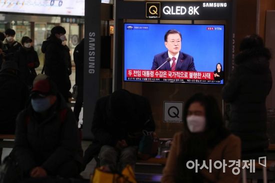 18일 서울역 대합실에서 시민들이 문재인 대통령의 신년 기자회견 생중계를 보고 있다. /문호남 기자 munonam@ |