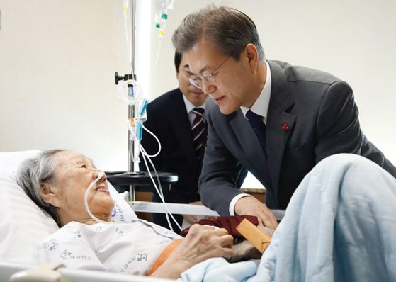 2018년 1월 4일 문재인 대통령이 서울 신촌 세브란스 병원에 입원한 '위안부' 피해자 김복동 할머니를 문병하고 있다. 한편 김 할머니는 2019년 향년 93세를 일기로 별세했다. [사진 청와대] |