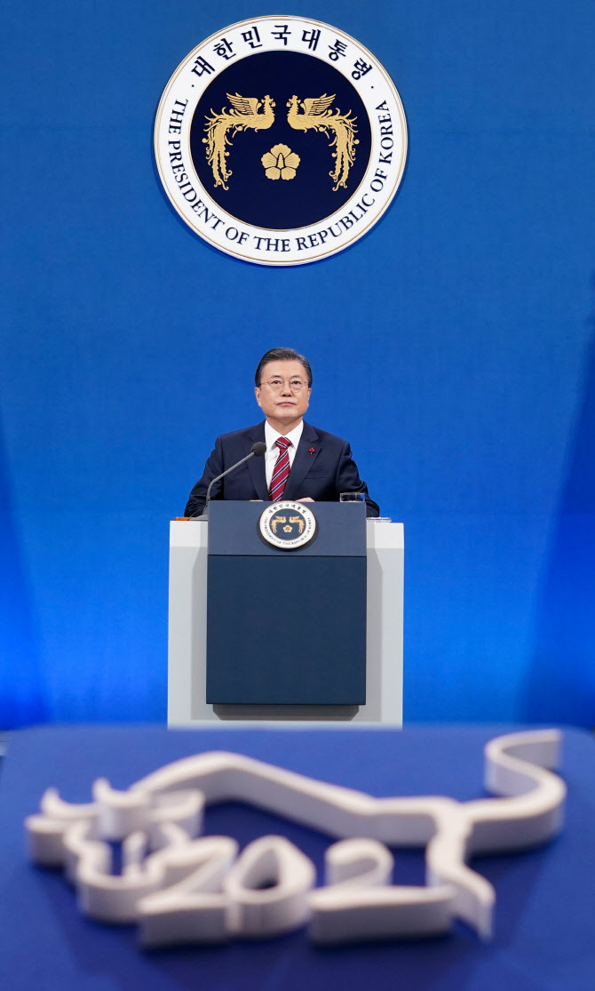 문재인 대통령이 18일 오전 청와대 춘추관에서 온·오프 혼합 방식으로 열린 ‘2021 신년 기자회견’에 참석해 화상으로 연결된 취재진을 바라보고 있다.(사진=뉴시스) |