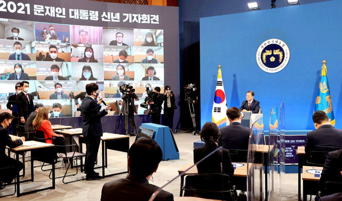코로나 감안 온·오프방식 병행 회견 문재인 대통령이 18일 청와대 춘추관에서 열린 신년 기자회견에서 기자의 질문에 답하고 있다. 이날 회견은 코로나19의 엄중한 상황을 감안해 처음으로 온·오프방식을 병행해 기자회견을 진행했다. 청와대사진기자단 |