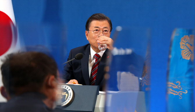 문재인 대통령이 18일 청와대 춘추관에서 열린 신년 기자회견에서 물을 마시고 있다 (사진=연합뉴스) |