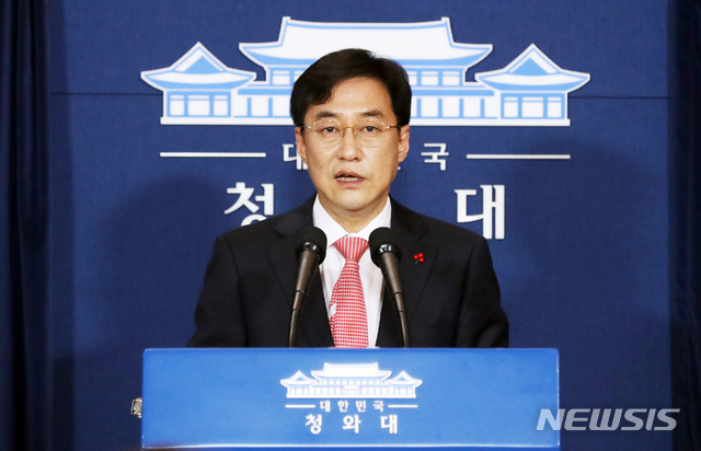 [서울=뉴시스박영태 기자 = 강민석 청와대 대변인이 14일 청와대 춘추관에서 박근혜 전 대통령의 사법부 판결과 관련한 브리핑을 하고 있다. 2021.01.14. since1999@newsis.com |