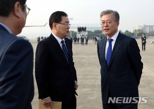 【성남=뉴시스】전신 기자 = 문재인 대통령과 정의용 전 청와대 국가안보실장. 2018.03.28. photo1006@newsis.com |