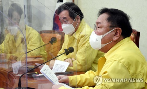 김태년 원내대표는 최고위 회의에서 "아무리 생각을 해봐도 정치 도의를 넘어선 발언"이라며 "제1야당 지도자가 현직 대통령을 범법자 취급하는 저주의 발언을 서슴지 않았다는 점에서 아주 유감스럽다"고 말했다.