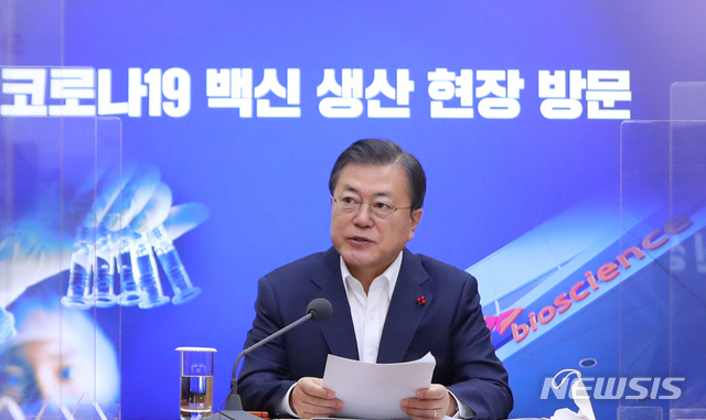 청와대는 이날 오전 문 대통령이 우리 국민이 맞게 될 아스트라제네카 백신의 생산 현장을 직접 살펴보고, 백신 생산이 차질 없이 이뤄질 수 있도록 노력하는 종사자(3교대 24시간 순환 근무)들을 격려했다고 밝혔다.