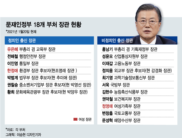 인사청문회가 마무리될 경우 비정치인 출신 장관은 10명으로 줄어든다. 18개 중앙부처 중 정치인 출신 장관이 8명이다. 정의용 후보자도 국회의원 출신이다. 교체설이 나왔던 산업통상자원부 장관, 해양수산부 장관 역시 현역 의원들이 후임자로 거론된다.