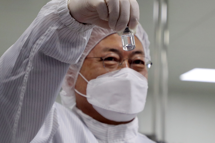 문재인 대통령이 20일 오전 경북 안동시 SK바이오사이언스 공장을 방문해 생산된 코로나19 백신을 살펴보고 있다. 연합뉴스 |